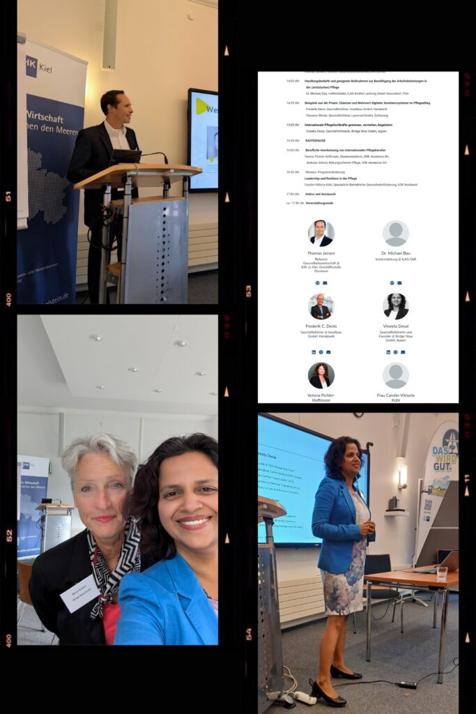Bei der jüngsten Veranstaltung „Pflegefachkräfte finden und halten“ haben wir wichtige Maßnahmen zur Verbesserung der Arbeitsbedingungen von Pflegekräften erörtert, (Dr. Michael Bau, Frederik C. Denis, Clemens Winter) und uns den Herausforderungen bei der Anerkennung ausländischer Abschlüsse gewidmet (Verena Pichler-Hoffmann, Herr Söllner). Die Diskussion konzentrierte sich auch auf Führungsaspekte im Pflegesektor (Carolin-Viktoria Kühl) und darauf, Gewinnung von Internationale Pflegefachkräften, Organisationen für die Integration internationaler Fachkräfte zu sensibilisieren und ihnen eine spannende Zukunft im hohen Norden Deutschlands zu ermöglichen (Geschäftsführerin – Vineeta Desai und Management Beraterin Frau Maren Krämer).